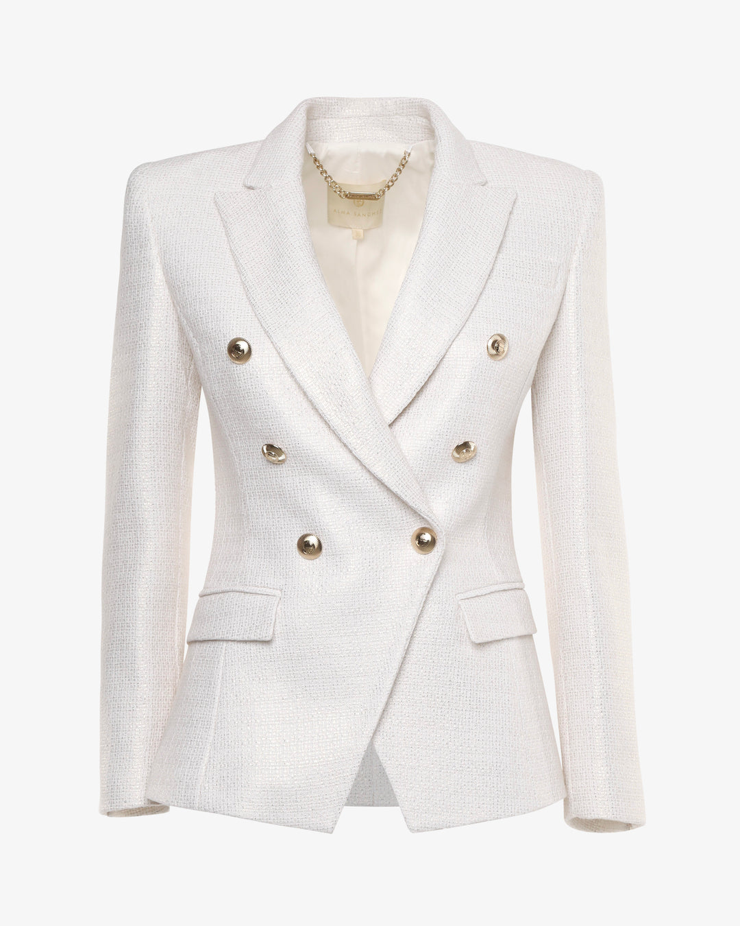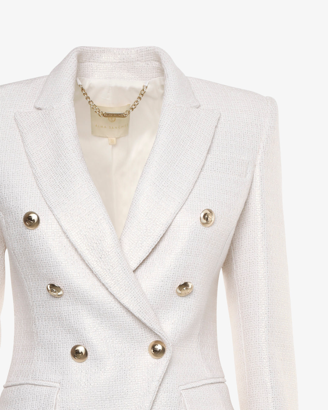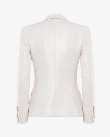 Eleganza senza tempo e un tocco di modernità si incontrano in questa giacca doppiopetto in tweed metallizzato. Il classico tessuto tweed viene reinterpretato con fili luminosi, regalando un effetto raffinato e sofisticato. Il taglio strutturato e il design doppiopetto valorizzano la silhouette, mentre i bottoni decorativi aggiungono un dettaglio ricercato. Perfetta da abbinare a pantaloni coordinati per un total look elegante o a jeans per un twist contemporaneo e chic. Ideale per chi ama distinguersi con stile.