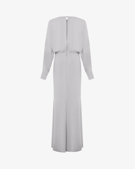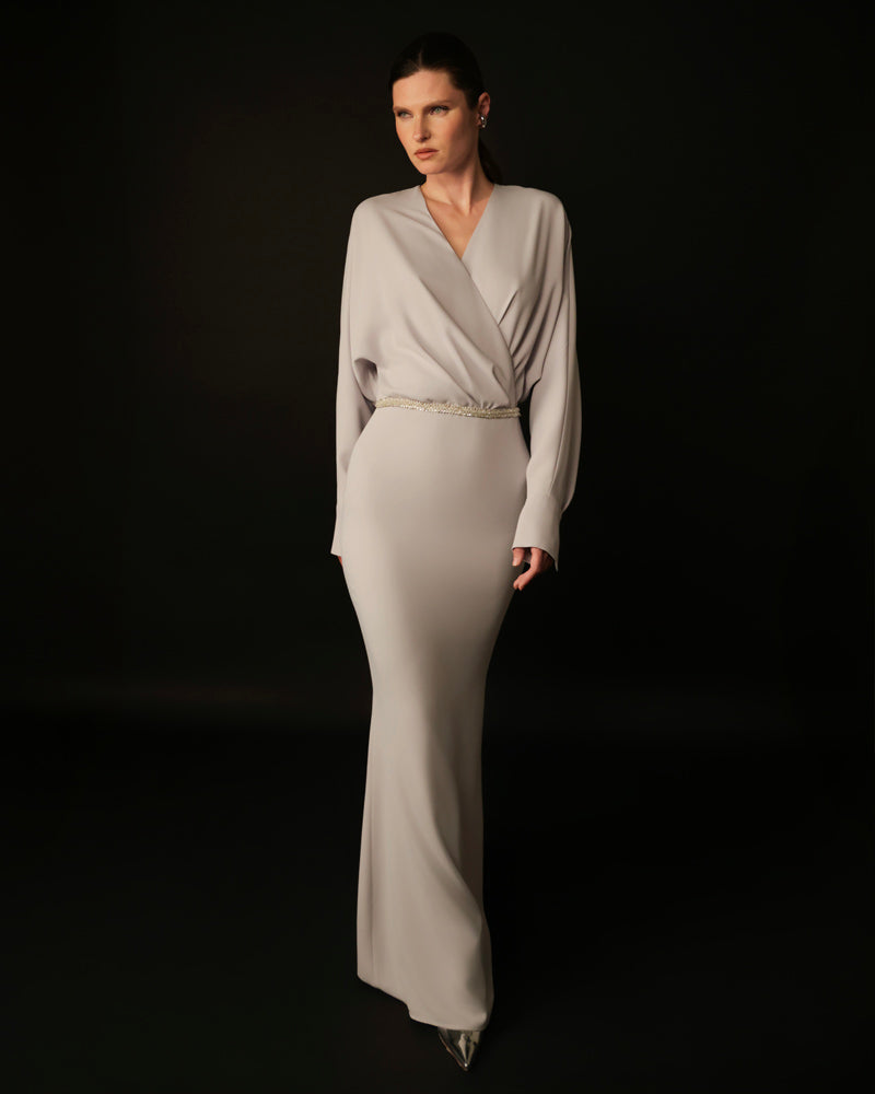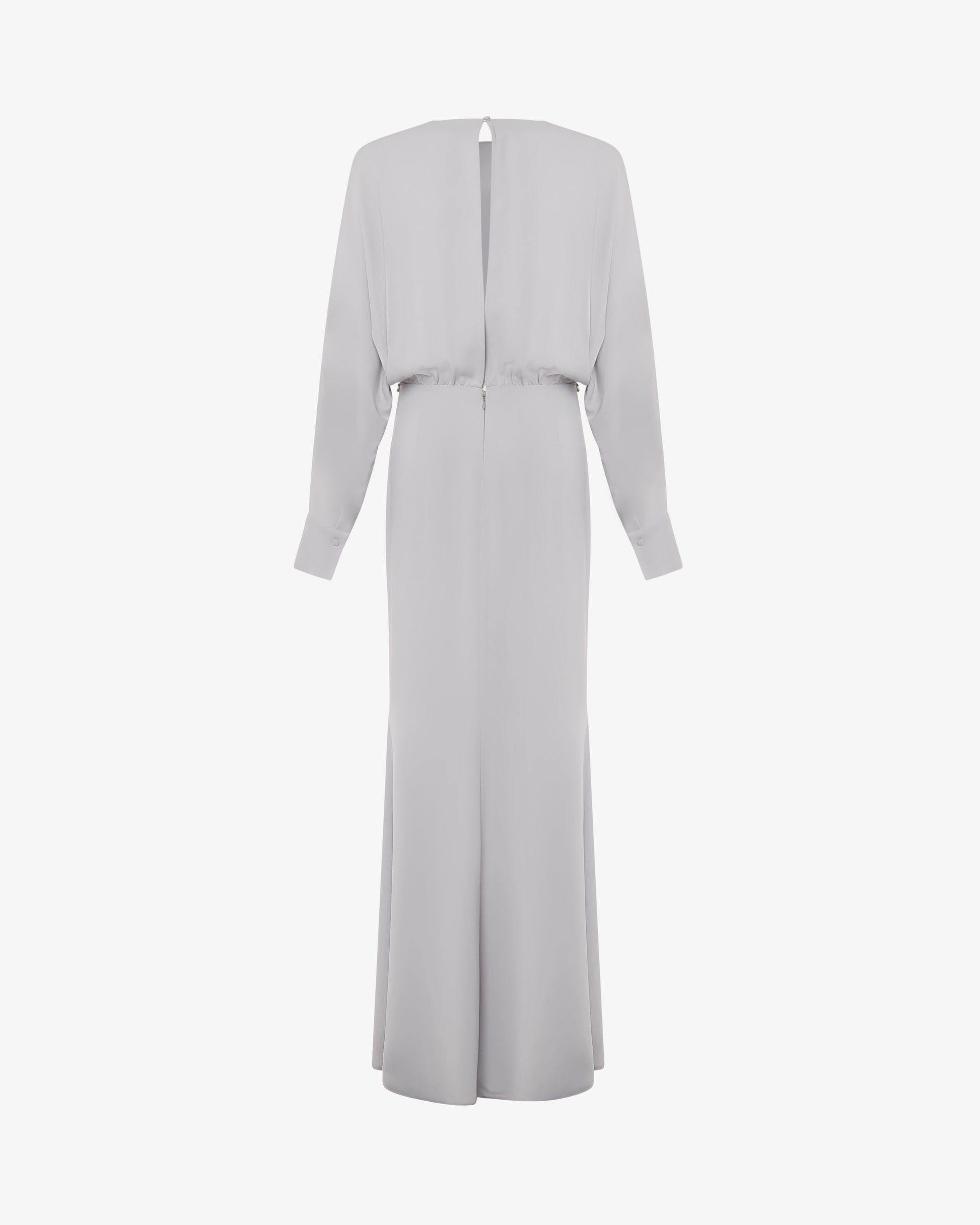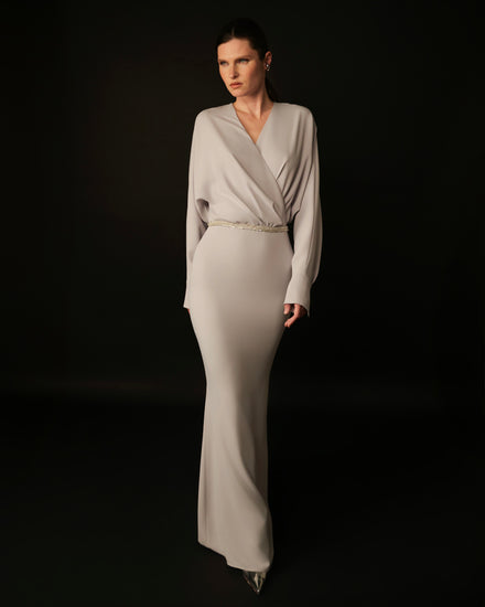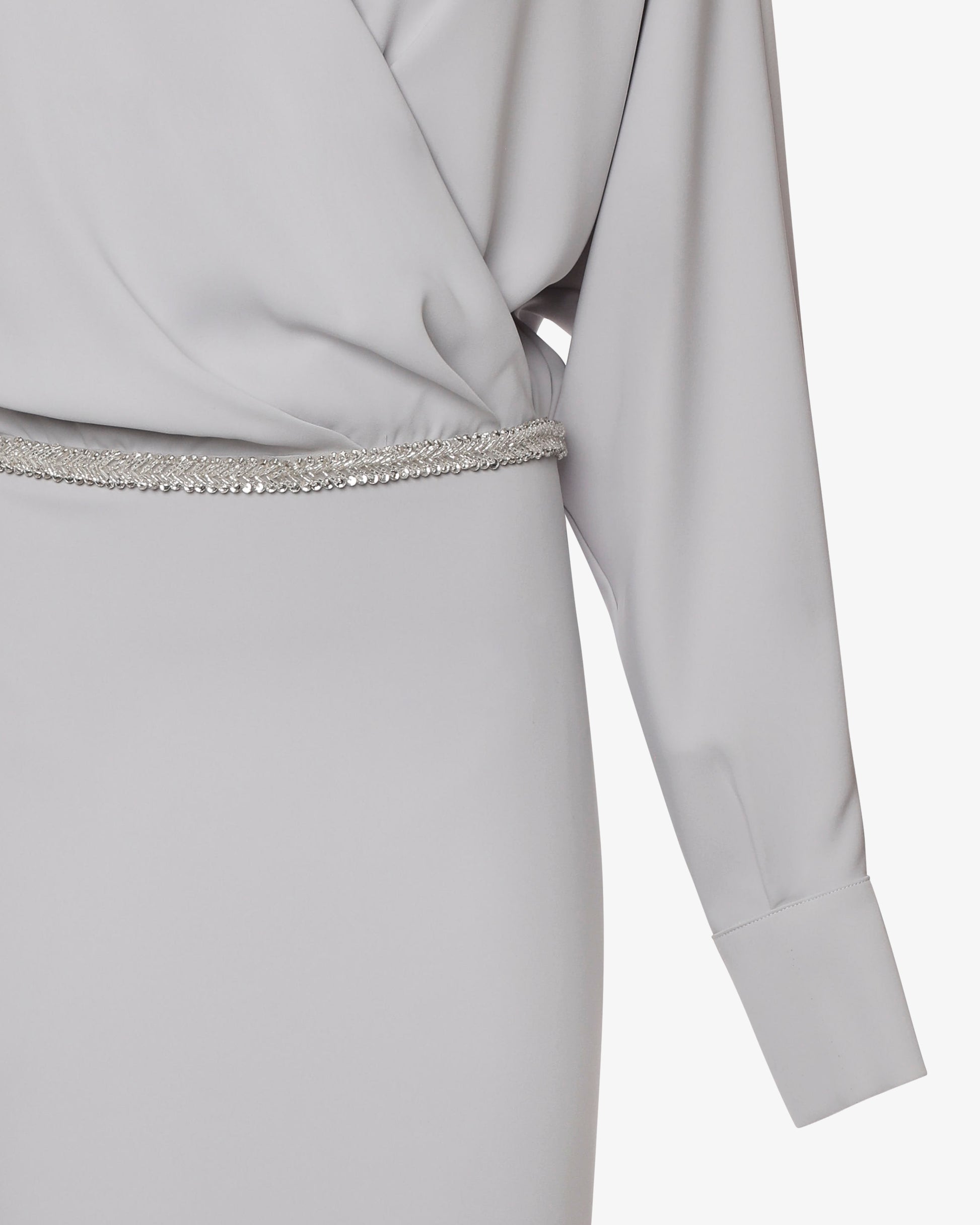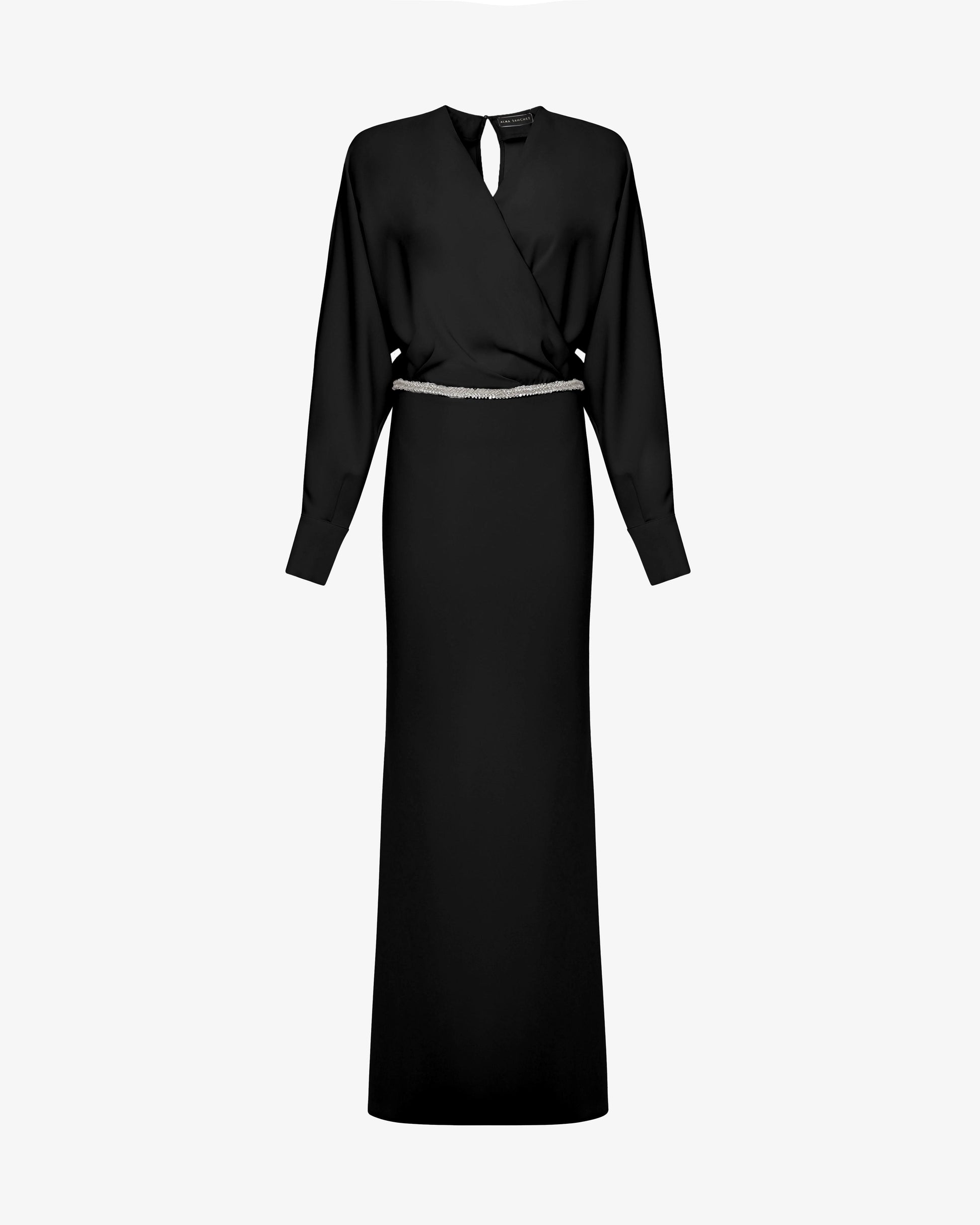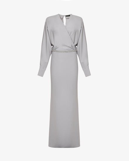 Abito lungo in tessuto fluido scollo incrociato e dettaglio gioiello